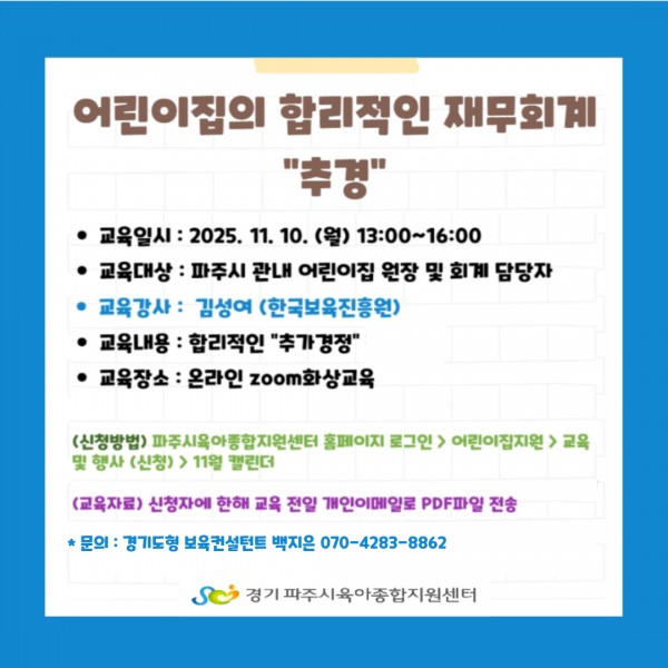 | 장소 | 온라인zoom실시간 화상교육 | 대상 | 파주시 관내 어린이집 원장 및 회계 담당자 |