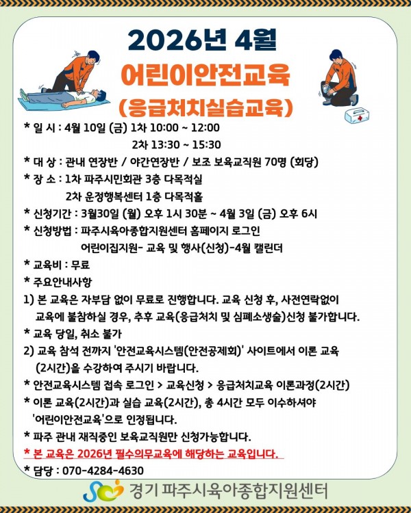- 다음글2026년 어린이 이용시설종사자 안전교육(응급처치 및 심폐소생술)-1차 26.03.19