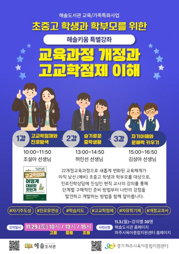 ※ 그 외 10:00~11:50 고교학점제와 진로탐색 / 13:00~14:50 슬기로운 중학생활 - 해솔도서관 홈페이지에서 신청