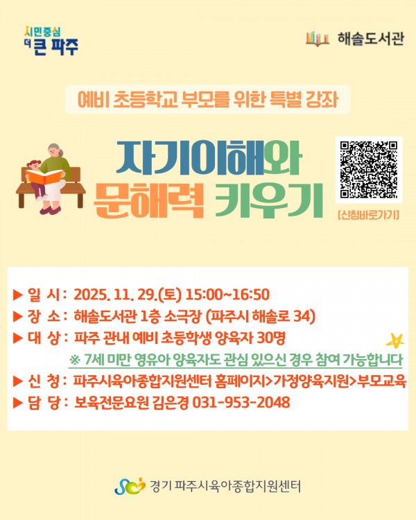| 장소 | 해솔도서관 | 대상 | 파주 관내 초등학교 취학 자녀를 둔 양육자 대상 |