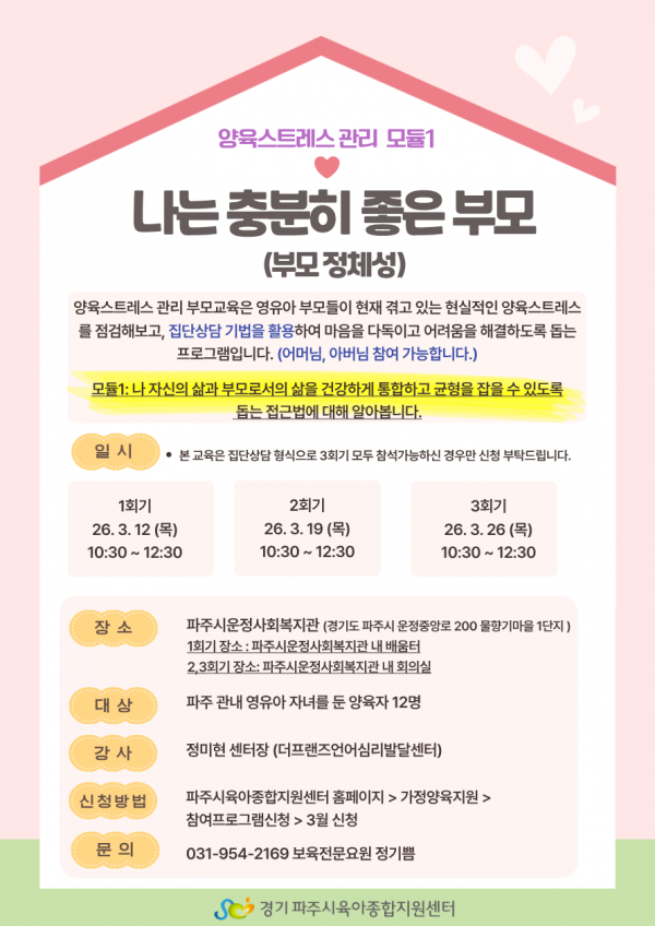 3회기(3. 12. / 3. 19. / 3. 26.(목) ) 모두 참여 가능하신 부모님 신청 부탁드립니다.