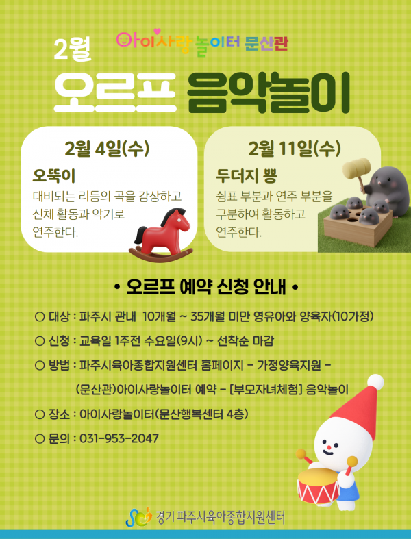 | 장소 | 아이사랑놀이터(문산행복센터 4층) | 대상 | 파주시 거주 10개월~35개월 미만 영유아와 양육자 |