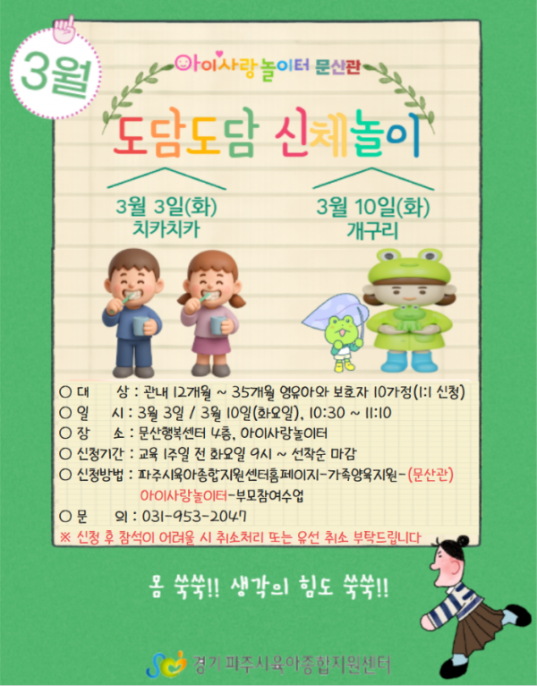 | 장소 | 아이사랑놀이터(문산행복센터 4층) | 대상 | 파주시 관내 12개월 이상~35개월 미만 영유아와 보호자 |