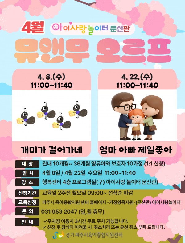 장소 문산행복센터 4층(프로그램실) 대상 파주시 거주 10개월~36개월 미만 영유아와 보호자