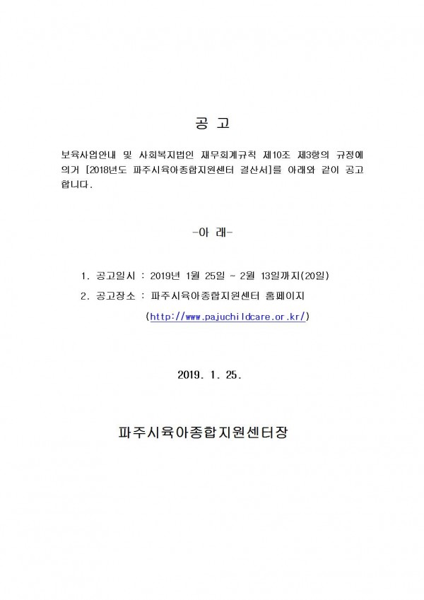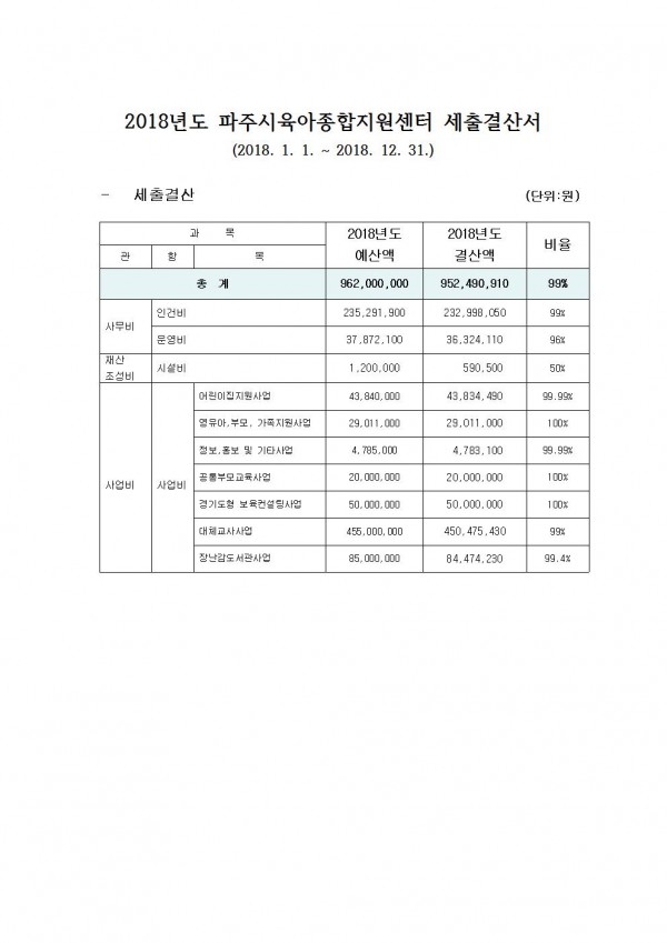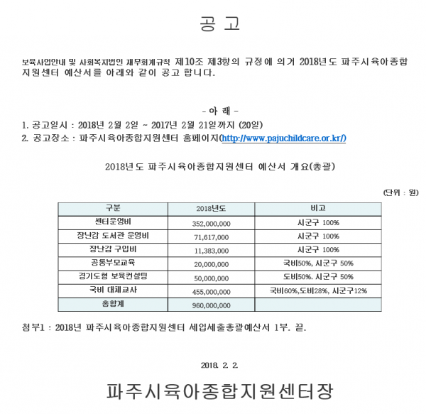 2018년도 파주시육아종합지원센터 예산 및 결산 공고 페이지 정보 작성자 관리자 댓글 0건 조회 1,394회 작성일 20-05-11 09:53 목록 본문 파주시육아종합지원센터 2018년도 예산 및 결산 공고 ♠ 첨부 1. 2018년 예산 공고 및 예산서 첨부 2. 2018년 결산 공고 및 결산서 이전글2019년도 파주시육아종합지원센터 예산 및 결산 공고 20.05.11