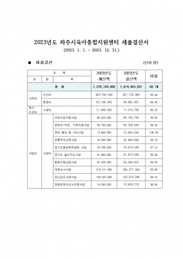 파주시육아종합지원센터 2024년도 예산 및 2023년도 결산 공고 페이지 정보 작성자 관리자 댓글 0건 조회 59회 작성일 24-01-25 14:51 목록 본문 파주시육아종합지원센터 2024년도 예산 및 2023년도 결산 공고 다음글2022년 파주시육아종합지원센터 결산공고 23.02.09