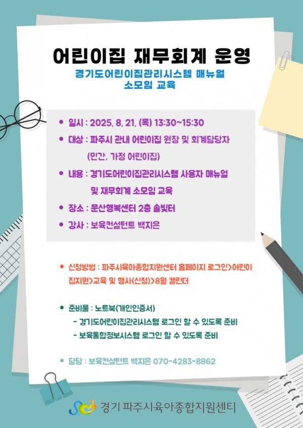 장소 | 문산행복센터 2층 솔빛터 | 대상 | 파주시 관내 어린이집 원장 및 회계담당자( 민간, 가정 어린이집) |
