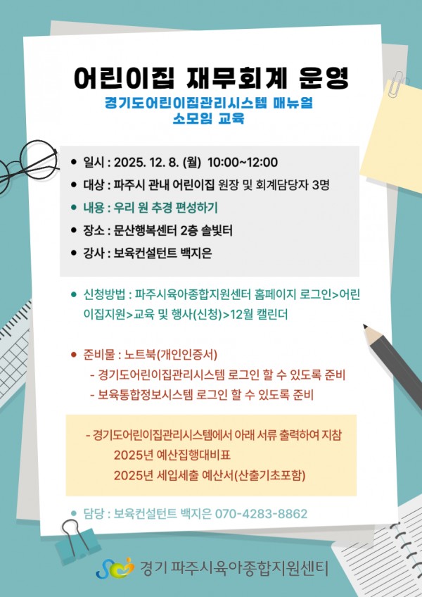 | 장소 | 문산행복센터 2층 솔빛터 | 대상 | 파주시 관내 어린이집 원장 및 회계담당자 |