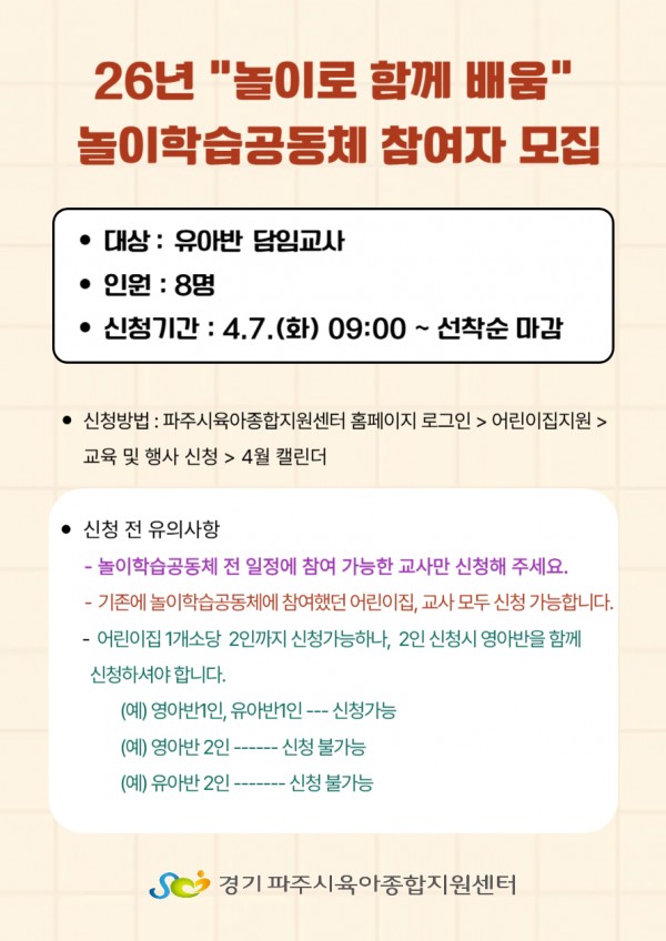 - 다음글"놀이로함께배움' 놀이학습공동체 참여자 모집(영아반) 26.03.26