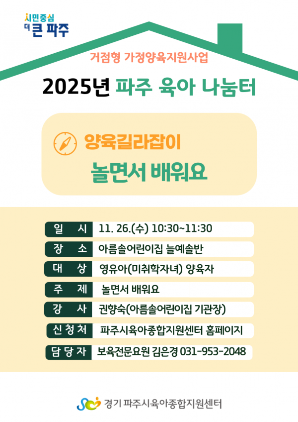 | 장소 | 아름솔어린이집 늘예솔반 | 대상 | 파주 관내 영유아 양육자 |