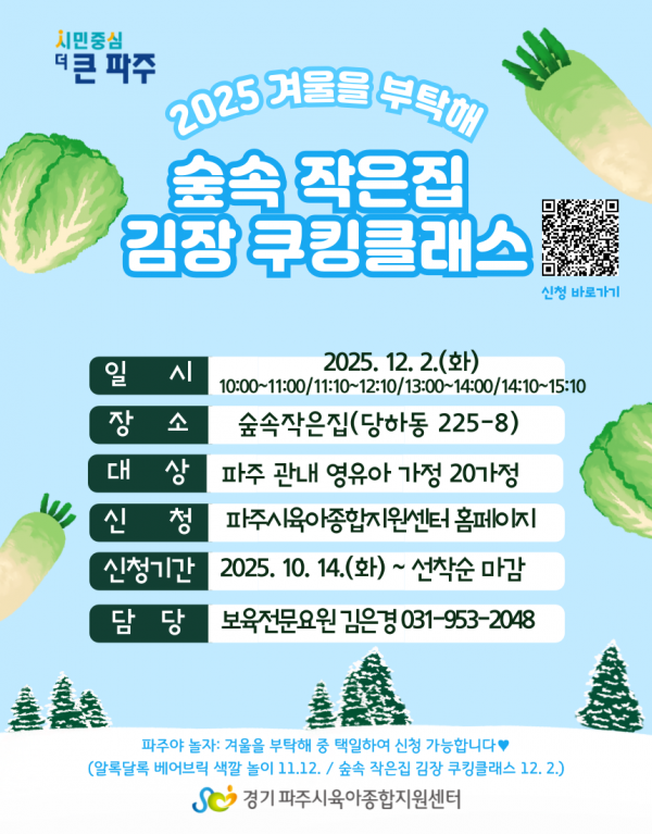※ 파주야 놀자: 겨울을 부탁해(11. 12.(수) 알록달록 베어브릭 색깔 놀이 / 12.2.(목) 숲속 작은 집 김장 쿠킹클래스) 중 택일하여 참여 가능합니다.