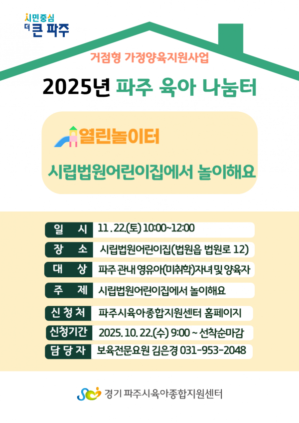 | 장소 | 시립법원어린이집 | 대상 | 파주 관내 영유아(미취학) 자녀 및 양육자 |