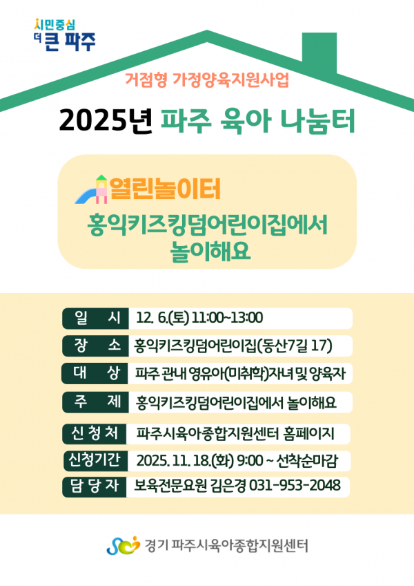 | 장소 | 홍익키즹덤어린이집(똥산7길 17) | 대상 | 파주 관내 영유아 가정 |