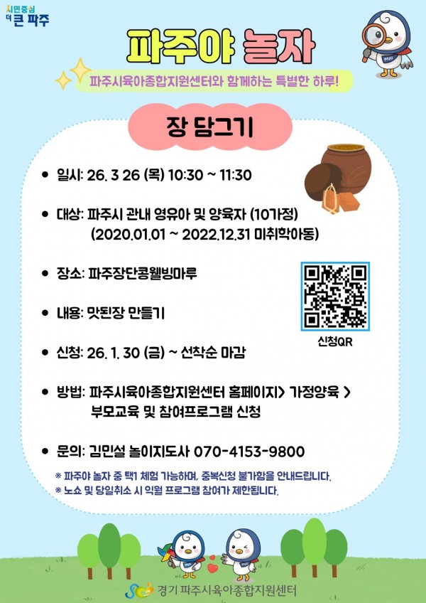 | 장소 | 파주장단콩웰빙마루 | 대상 | 파주시 관내 영유아 및 양육자 (2020.01.01~2022.12.31) |