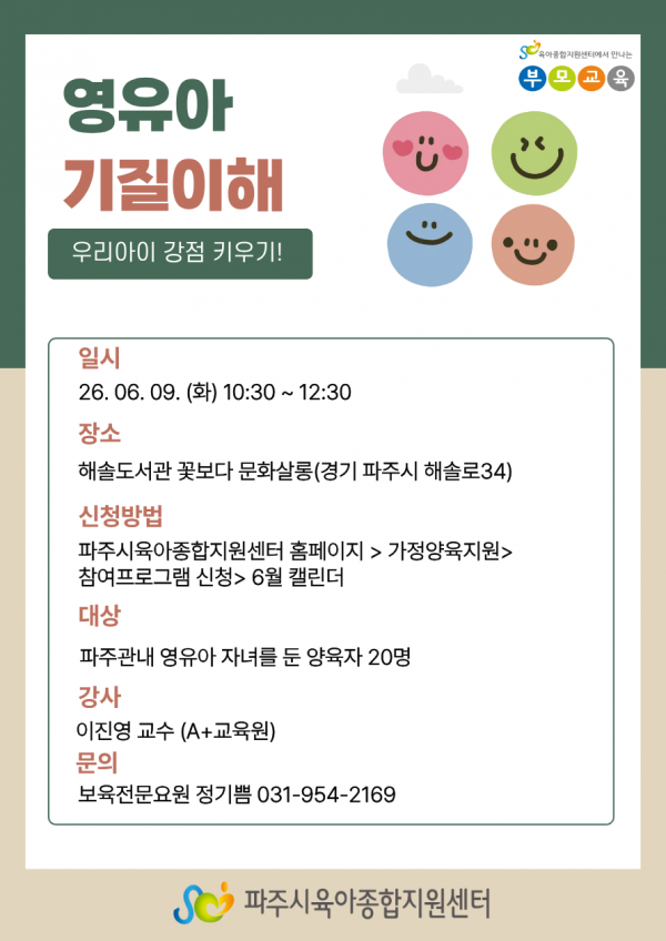 | 장소 | 해솔도서관 꽃보다문화살롱 | 대상 | 파주 관내 영유아 자녀를 둔 양육자 20명 |