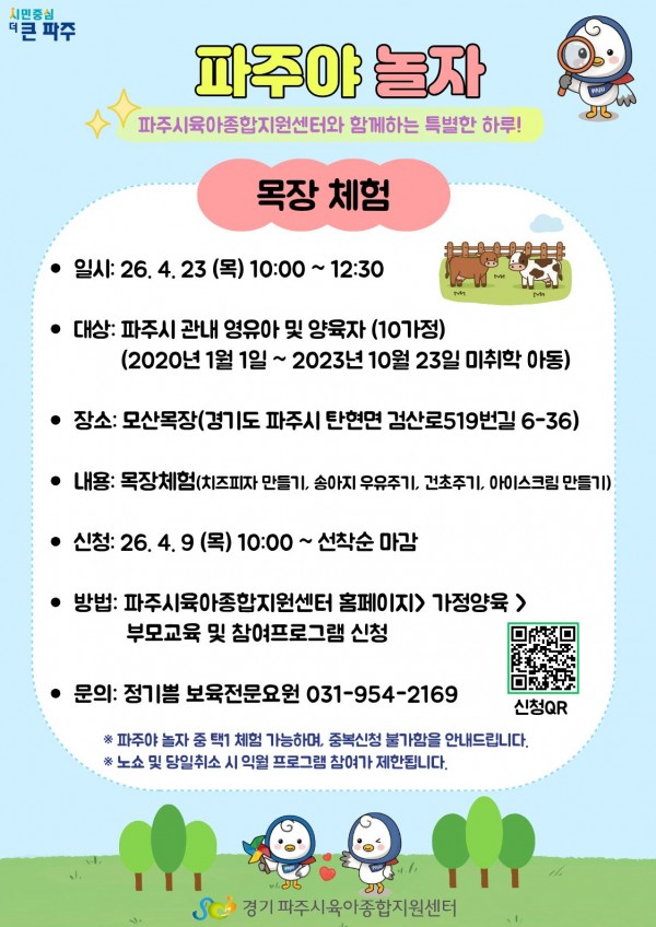 | 장소 | 모산목장(경기도 파주시 탄현면 검산로519번길 6-36) | 대상 | 파주시 관내 영유아 및 양육자 (10가정) (2020년 1월 1일 ~ 2023년 10월 23일 미취학 아동) |