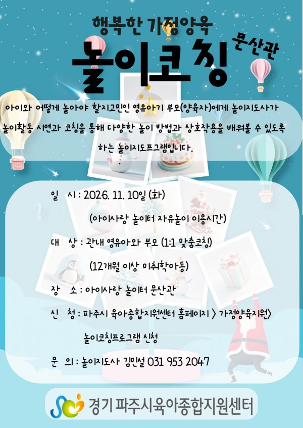 | 장소 | 아이사랑 놀이터 문산관 | 대상 | 관내 영유아와 부모 (12개월이상~미취학) |