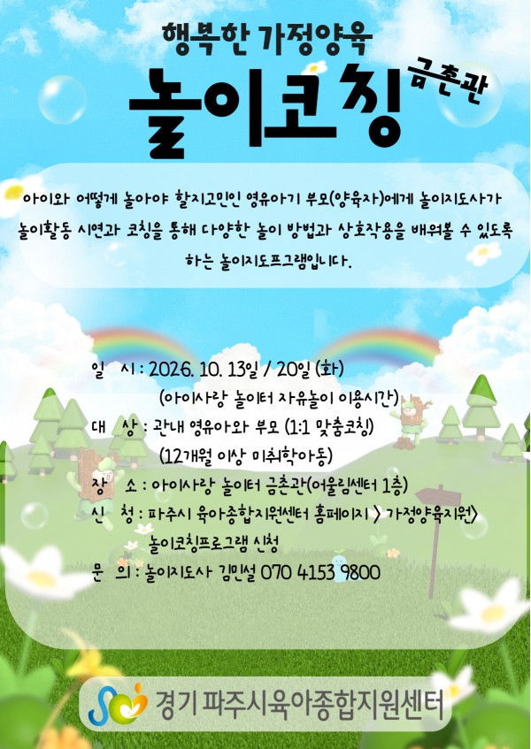 | 장소 | 아이사랑 놀이터 금촌관(어울림 센터 1층) | 대상 | 관내 영유아와 부모 (12개월이상~미취학) |
