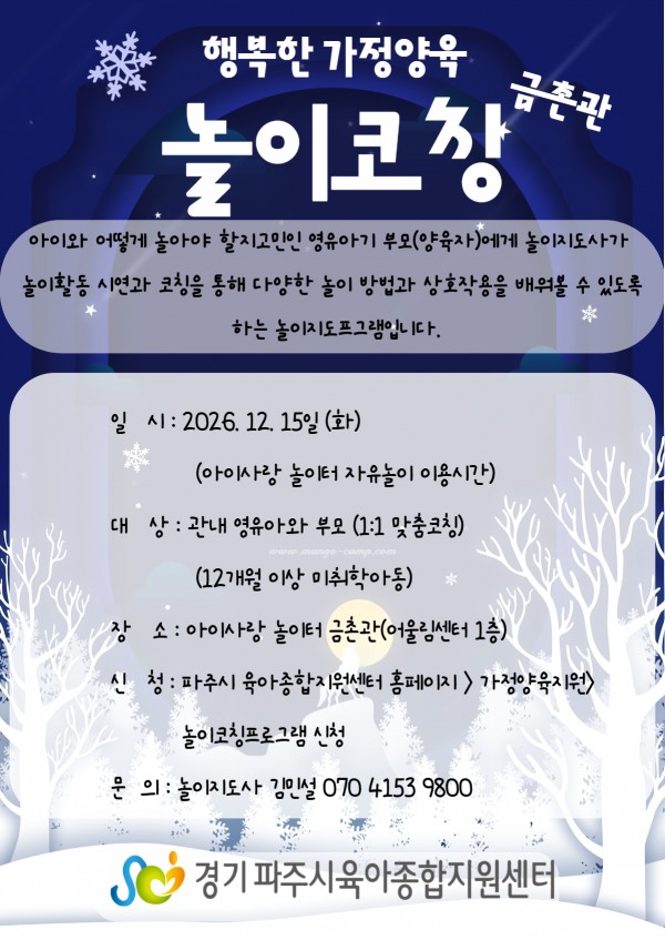 | 장소 | 아이사랑 놀이터 금촌관(어울림 센터 1층) | 대상 | 관내 영유아와 부모 (12개월이상~미취학) |