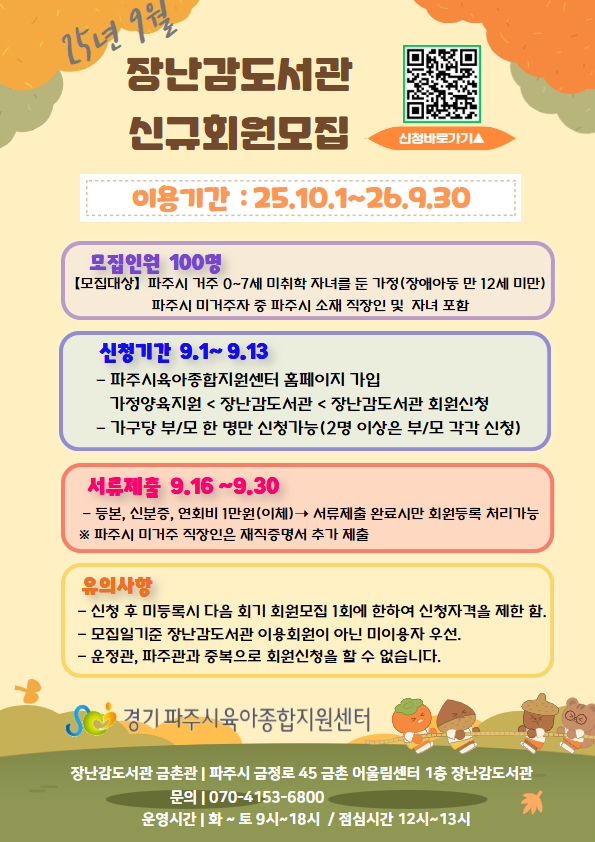 ● 영유아 자녀 1인, 파주시 관내 장난감도서관 1곳만 이용 가능하오니 선착순 신청으로 인한