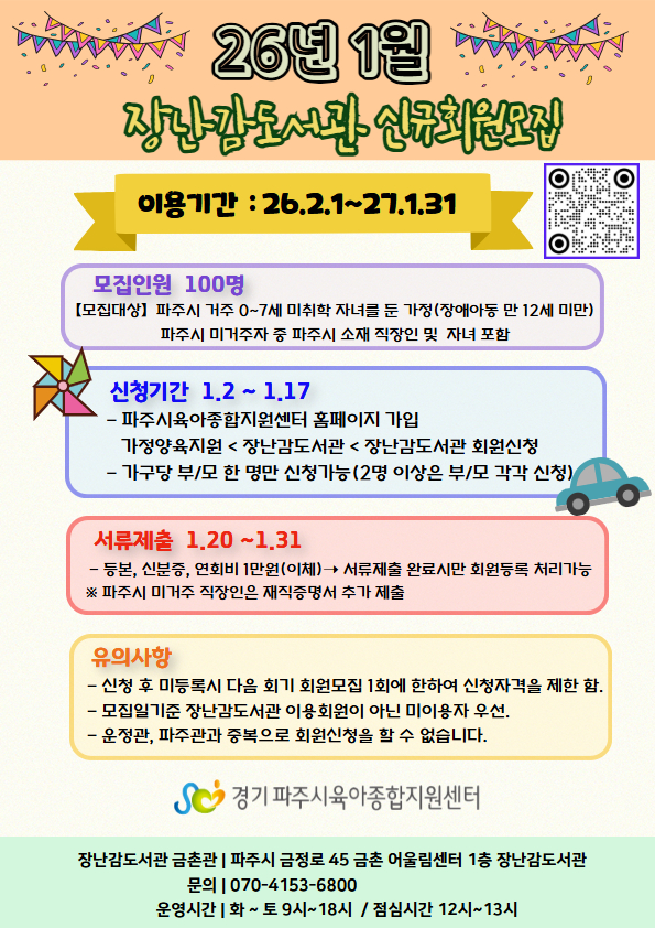 ● 영유아 자녀 1인, 파주시 관내 장난감도서관 1곳만 이용 가능하오니 선착순 신청으로 인한