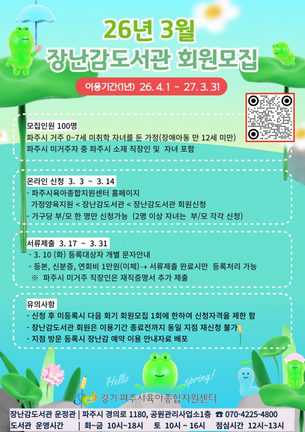 ● 영유아 자녀 1인, 파주시 관내 장난감도서관 1곳만 이용 가능하오니 선착순 신청으로 인한