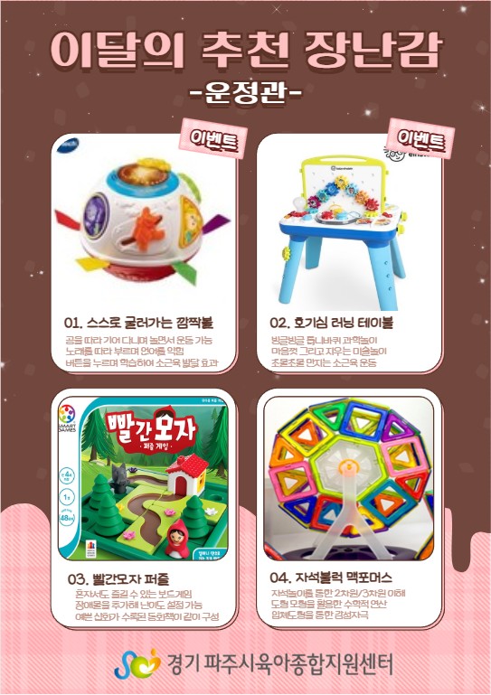 [운정관] 이달의 추천장난감 - 10월 페이지 정보 작성자 관리자 댓글 0건 조회 69회 작성일 25-10-01 17:50 목록 본문 . 이전글[금촌관] 이달의 추천장난감 - 10월 25.10.01 다음글[파주관] 이달의 추천장난감 - 10월 25.10.01