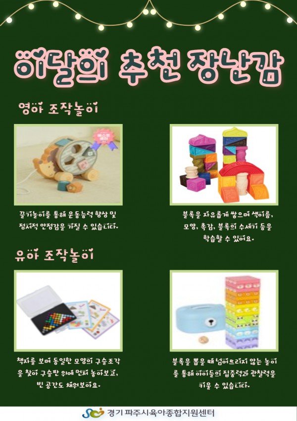 [운정관] 이달의 추천장난감 - 2월 페이지 정보 작성자 관리자 댓글 0건 조회 5회 작성일 26-02-03 11:41 목록 본문 . 다음글[파주관] 이달의 추천장난감 - 2월 26.01.31