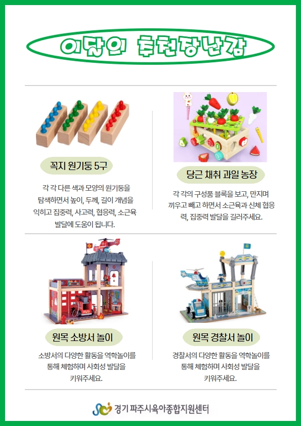 [파주관] 이달의 추천장난감 - 3월 페이지 정보 작성자 관리자 댓글 0건 조회 6회 작성일 26-02-28 15:49 목록 본문 . 다음글[운정관] 이달의 추천장난감 - 3월 26.02.28