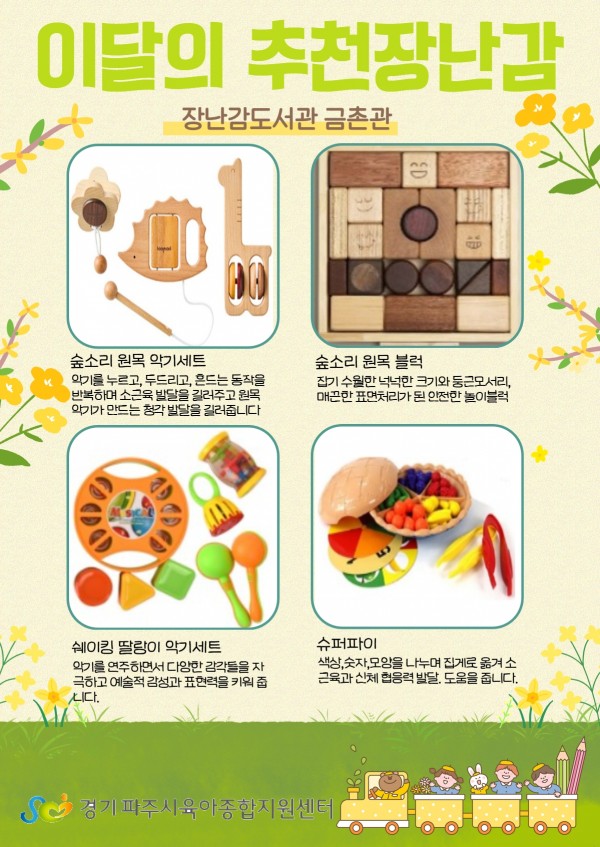 [금촌관] 이달의 추천장난감 - 4월 페이지 정보 작성자 관리자 댓글 0건 조회 4회 작성일 26-04-07 13:49 목록 본문 . 다음글[금촌관] 이달의 추천장난감 - 3월 26.03.12