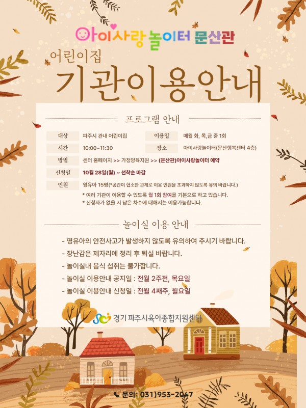 | 장소 | 아이사랑놀이터(문산행복센터 4층) | 대상 | 파주시 관내 어린이집 영유아 |