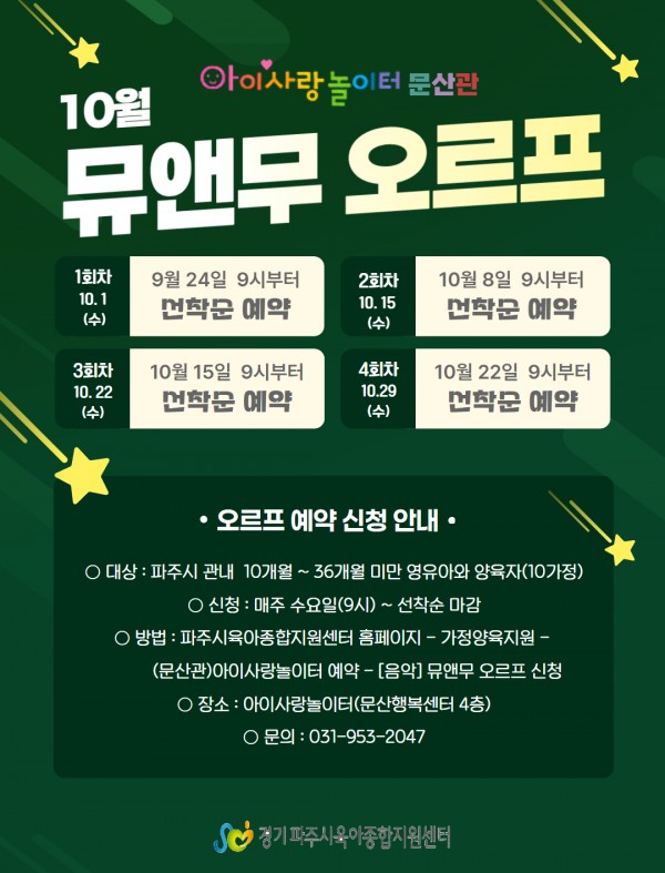 장소 | 아이사랑놀이터(문산행복센터 4층) | 대상 | 파주시 관내 10개월 이상~36개월 미만 영유아와 양육자 |