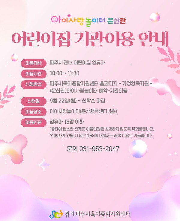 장소 | 아이사랑놀이터(문산행복센터 4층) | 대상 | 파주시 관내 어린이집 영유아 |