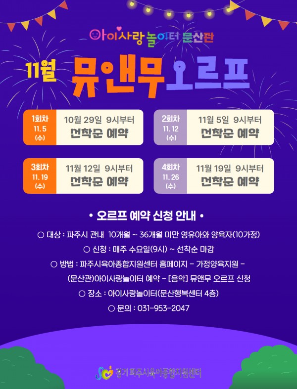 장소 | 아이사랑놀이터(문산행복센터 4층) | 대상 | 파주시 관내 10개월 이상~36개월 미만 영유아와 양육자 |