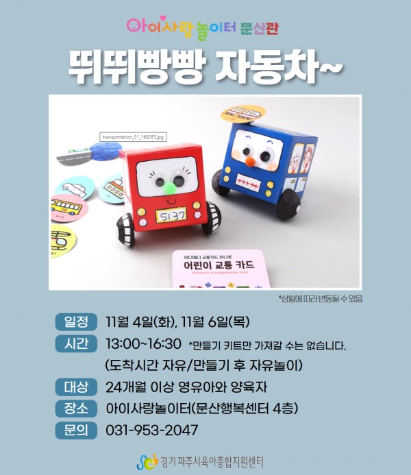 장소 | 아이사랑놀이터(문산행복센터 4층) | 대상 | 파주시 관내 24개월 이상~미취학 영유아와 보호자 |