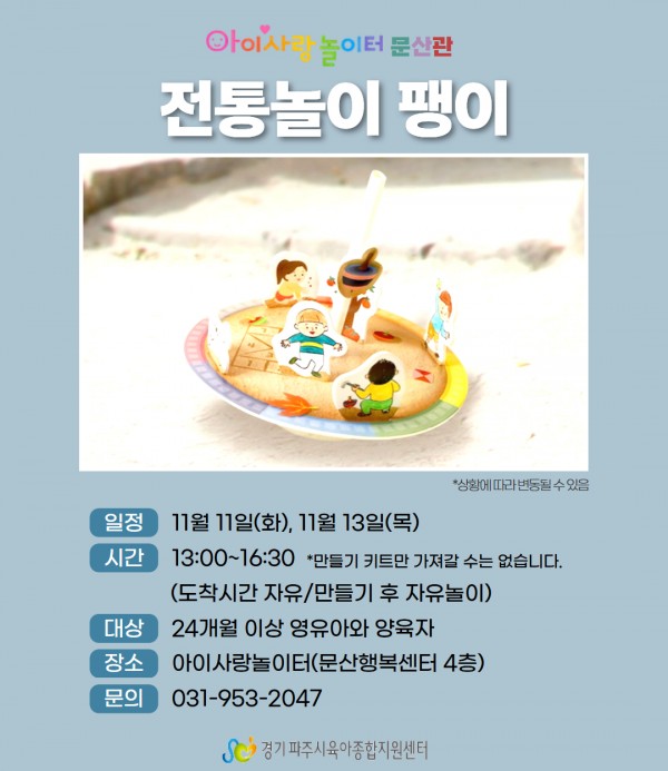 장소 | 아이사랑놀이터(문산행복센터 4층) | 대상 | 파주시 관내 24개월 이상~미취학 영유아와 보호자 |