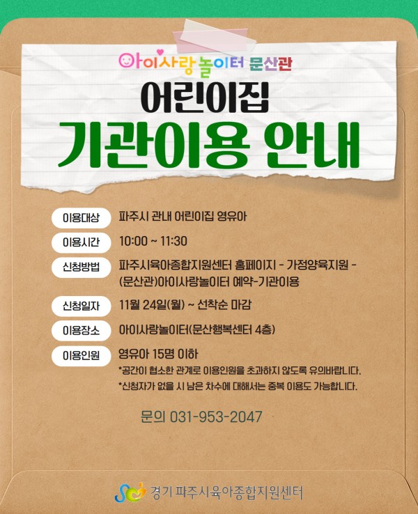 | 장소 | 아이사랑놀이터(문산행복센터 4층) | 대상 | 파주시 관내 어린이집 영유아 |