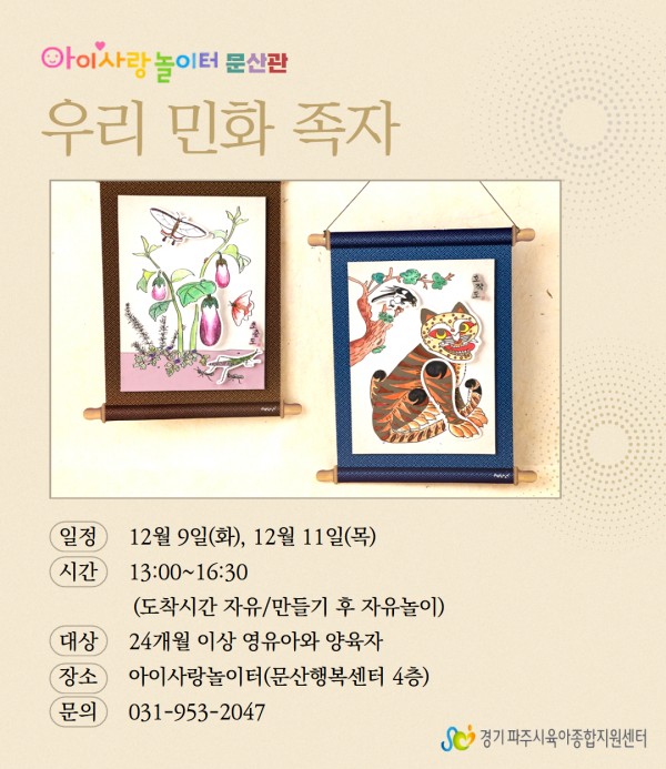 | 장소 | 아이사랑놀이터(문산행복센터 4층) | 대상 | 파주시 관내 24개월 이상~미취학 영유아와 보호자 |
