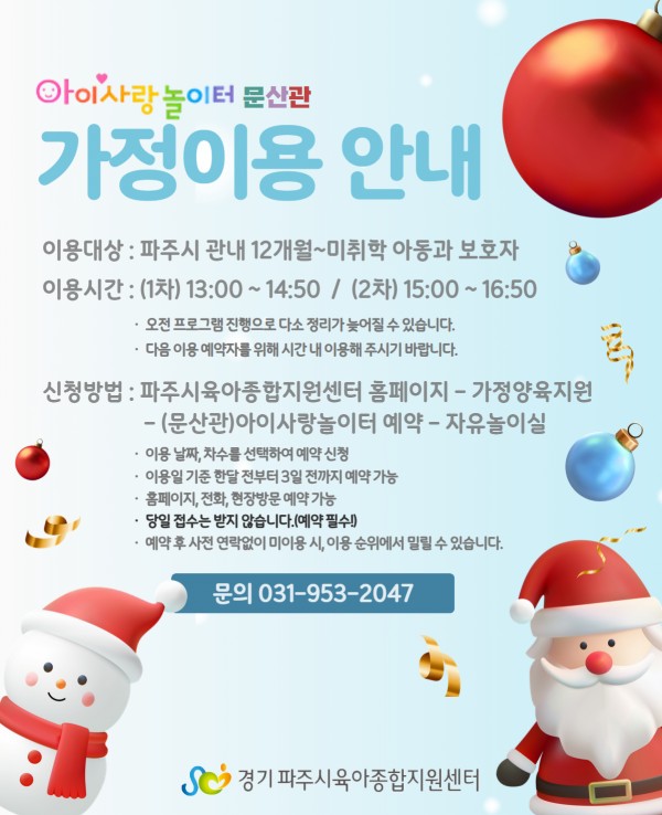 | 장소 | 아이사랑놀이터(문산행복센터 4층) | 대상 | 파주시 관내 12개월 이상~미취학 영유아와 보호자 |