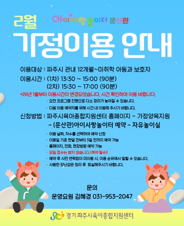 | 장소 | 아이사랑놀이터(문산행복센터 4층) | 대상 | 파주시 관내 12개월 이상~미취학 영유아와 보호자 |