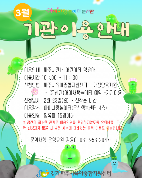 | 장소 | 아이사랑놀이터(문산행복센터 4층) | 대상 | 파주시 관내 어린이집 영유아 |