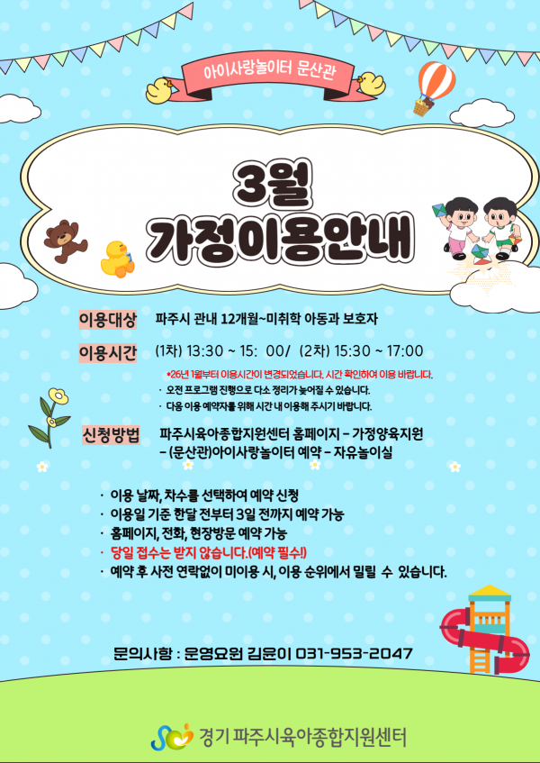 | 장소 | 아이사랑놀이터(문산행복센터 4층) | 대상 | 파주시 관내 12개월 이상~미취학 영유아와 보호자 |