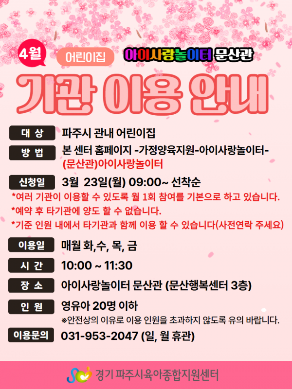| 장소 | 문산행복센터 3층(아이사랑놀이터) | 대상 | 파주시 관내 어린이집 |