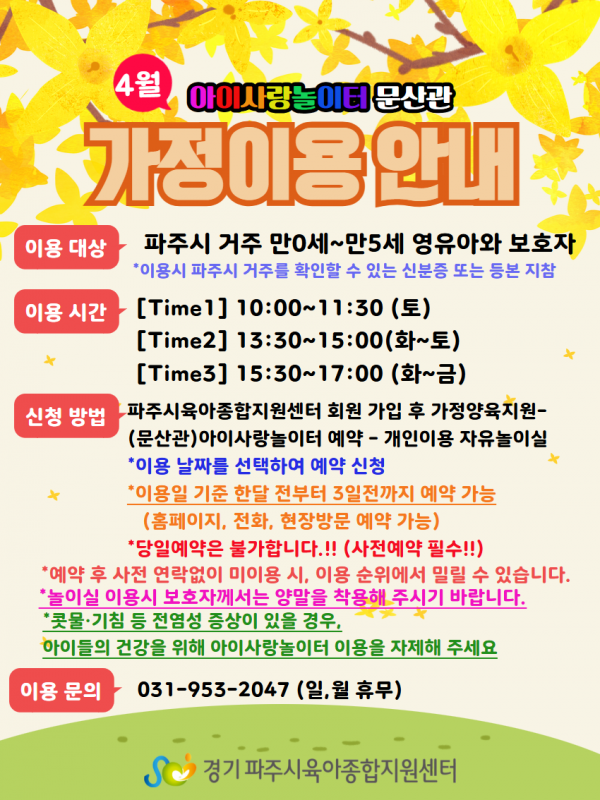 | 장소 | 문산행복센터 3층 | 대상 | 파주시 거주 만0세~만5세 영유아와 보호자 |