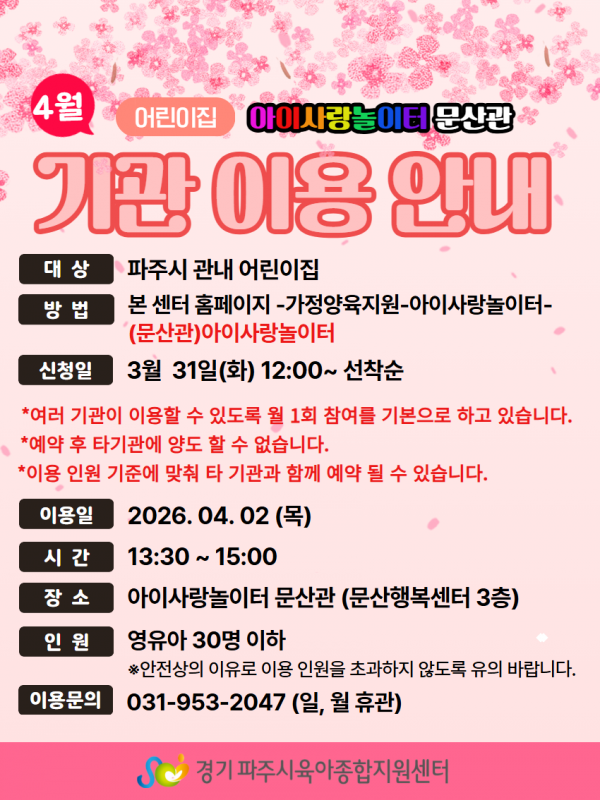 (10813) 경기도 파주시 문산읍 통일로 1680 문산행복센터 3층 파주시육아종합지원센터