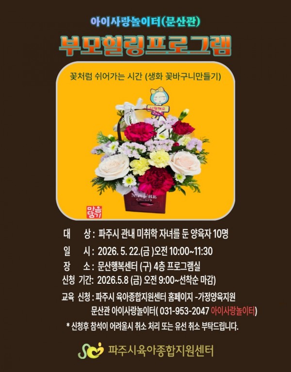 | 장소 | 문산행복센터 4층 프로그램실 | 대상 | 파주시 관내 미취학 자녀를 둔 양육자 |