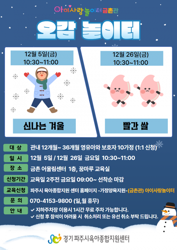 | 장소 | 금촌어울림센터 1층, 꿈마루교육실 | 대상 | 파주시 거주 12개월~36개월 영유아와 보호자 |