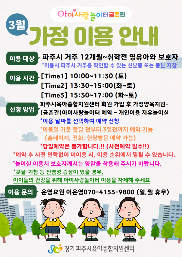| 장소 | 금촌어울림센터 1층(금정로 45) | 대상 | 파주시 거주 12개월~취학 전영유아와 보호자 |