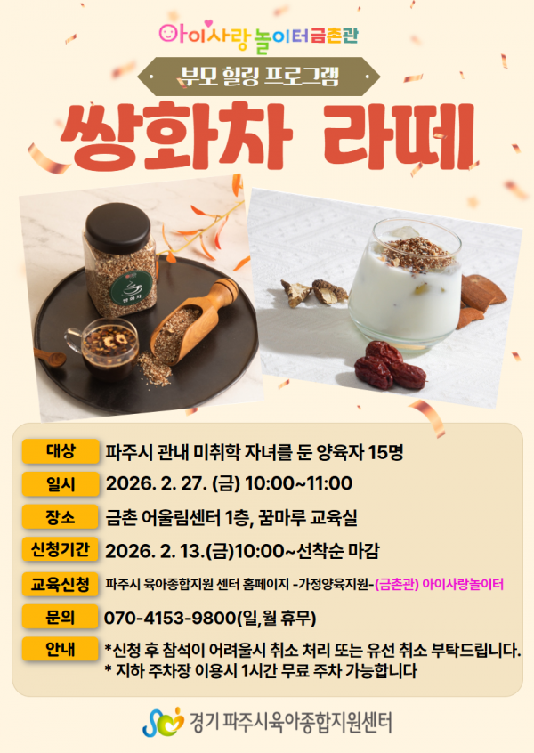 | 장소 | 금촌어울림센터 1층, 꿈마루 교육실 | 대상 | 파주시 관내 미취학 아동을 양육하는 양육 |
