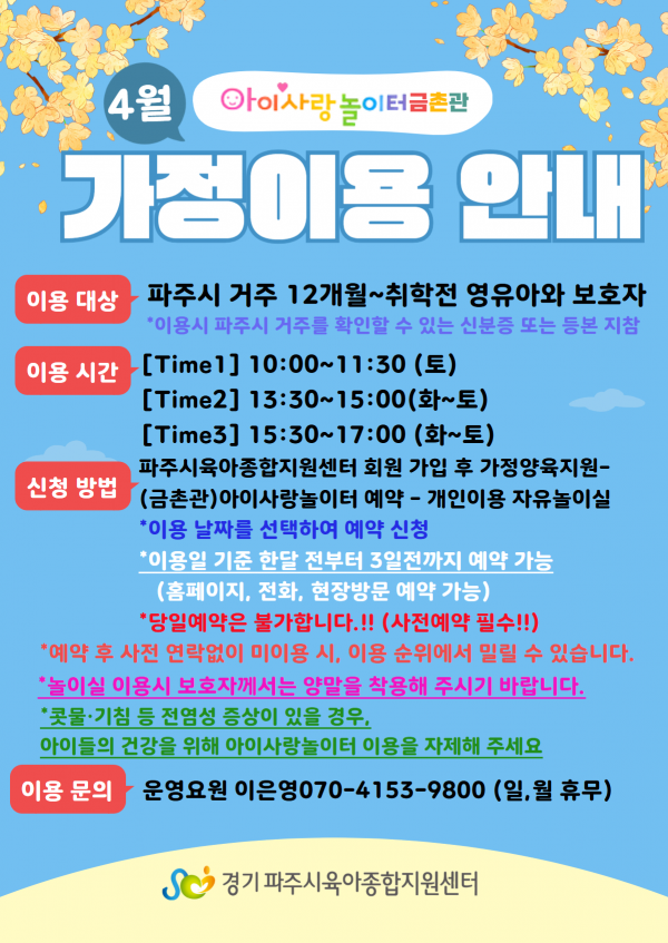 | 장소 | 금촌어울림센터 1층(금정로 45) | 대상 | 파주시 거주 12개월~취학 전 영유아와 보호자 |
